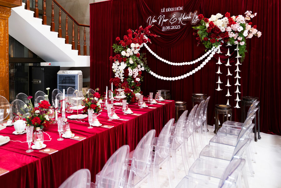 Gam đỏ tượng trưng cho tình yêu mãnh liệt, trong khi hồng phấn mang lại nét dịu dàng, nữ tính. Khi kết hợp khéo léo, hai màu này giúp không gian tiệc cưới trở nên vừa lãng mạn vừa thời thượng.