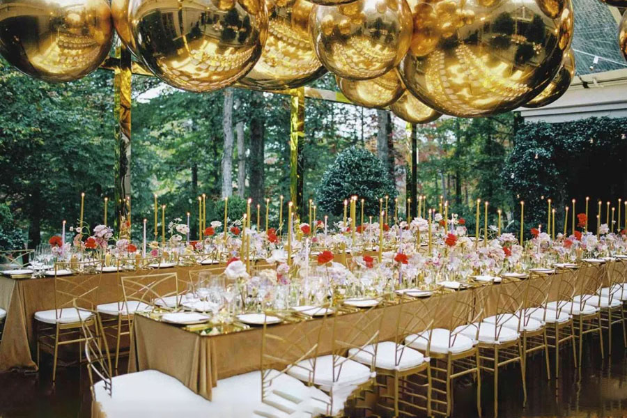 Vàng đồng tượng trưng cho sự thịnh vượng, trong khi trắng kem lại mang đến cảm giác tinh khôi và thanh lịch. Sự kết hợp này tạo nên tổng thể hài hòa, thích hợp cho những tiệc cưới mang phong cách châu Âu hiện đại hoặc cổ điển sang trọng.