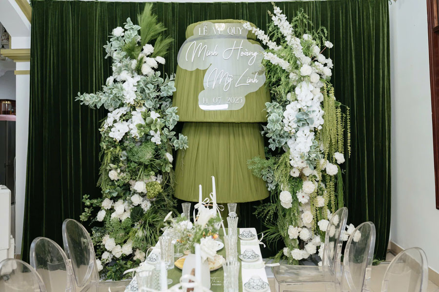 Trang trí bàn tiệc với lá ô liu, hoa baby trắng hoặc hoa hồng kem sẽ giúp tổng thể trở nên mềm mại và thanh thoát. Bảng màu này đặc biệt phù hợp với những cặp đôi yêu thích phong cách tối giản, nhẹ nhàng nhưng vẫn sang trọng.