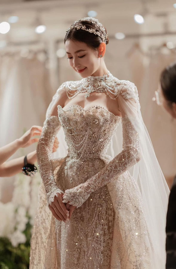 Cape được gắn bằng nút bấm hoặc móc nhỏ, giúp cô dâu có thể dễ dàng tháo ra sau khi chụp ảnh hoặc khi muốn thay đổi phong cách.