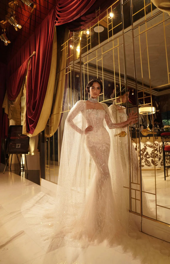 Khi cô dâu khoác lên người cape hoàng gia, tổng thể trang phục trở nên vô cùng tráng lệ – hoàn hảo cho các bối cảnh như sảnh tiệc sang trọng, nhà thờ hoặc không gian châu Âu mùa đông.