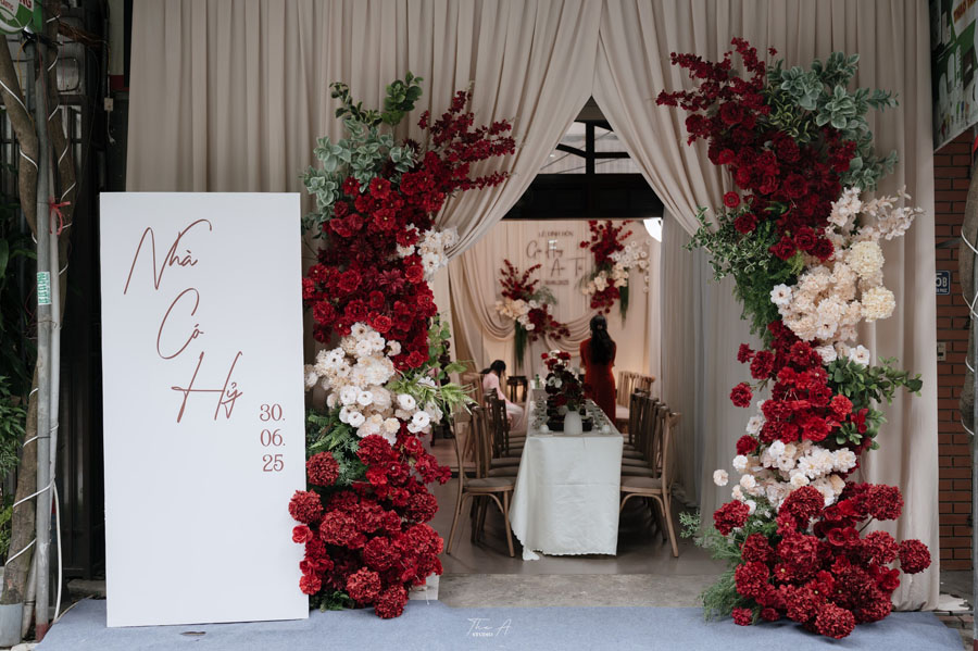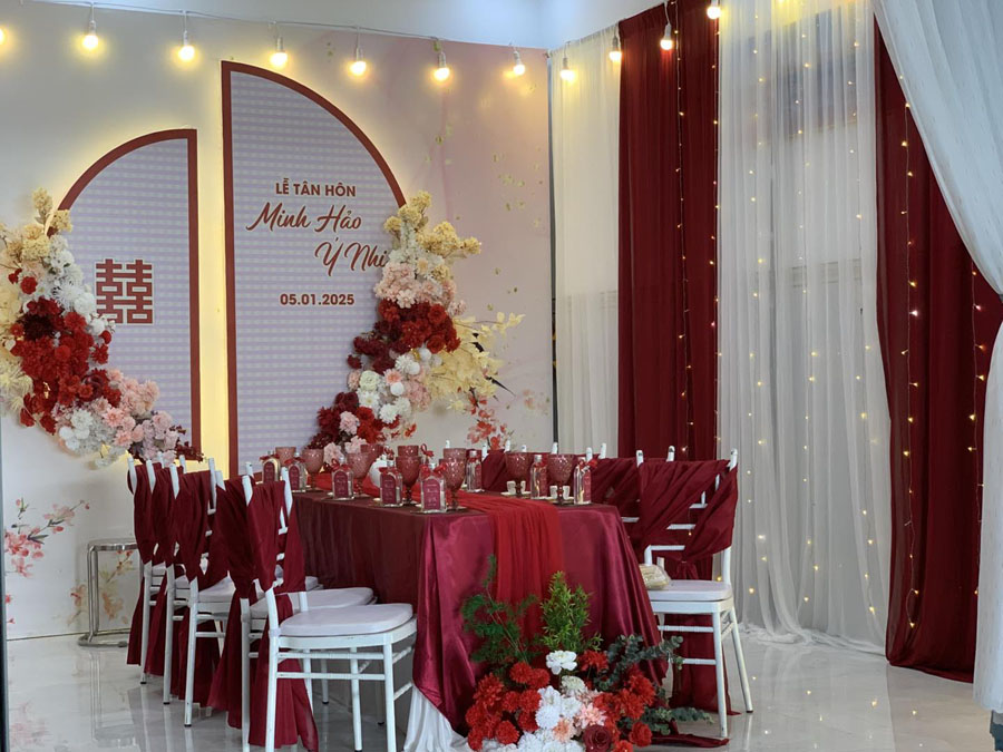 Gam đỏ tượng trưng cho tình yêu mãnh liệt, trong khi hồng phấn mang lại nét dịu dàng, nữ tính. Khi kết hợp khéo léo, hai màu này giúp không gian tiệc cưới trở nên vừa lãng mạn vừa thời thượng.