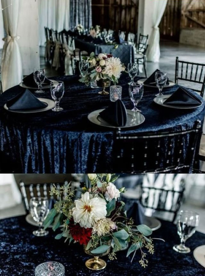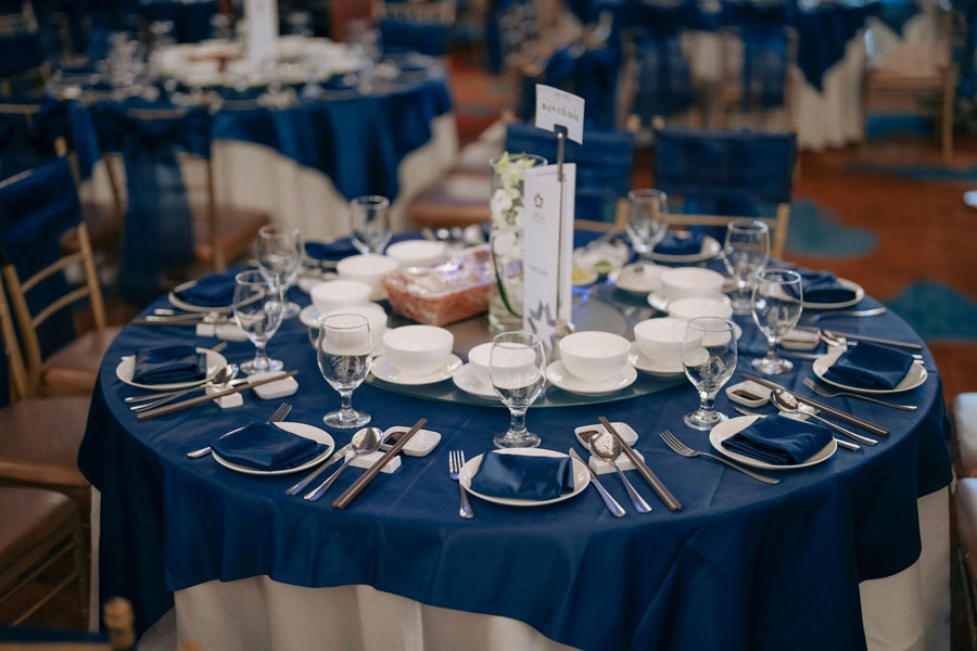 Nếu bạn là người yêu thích sự tinh tế, nhẹ nhàng nhưng vẫn muốn tạo điểm nhấn, thì xanh navy kết hợp với xám bạc chính là lựa chọn lý tưởng cho bảng màu trang trí tiệc cưới mùa thu.