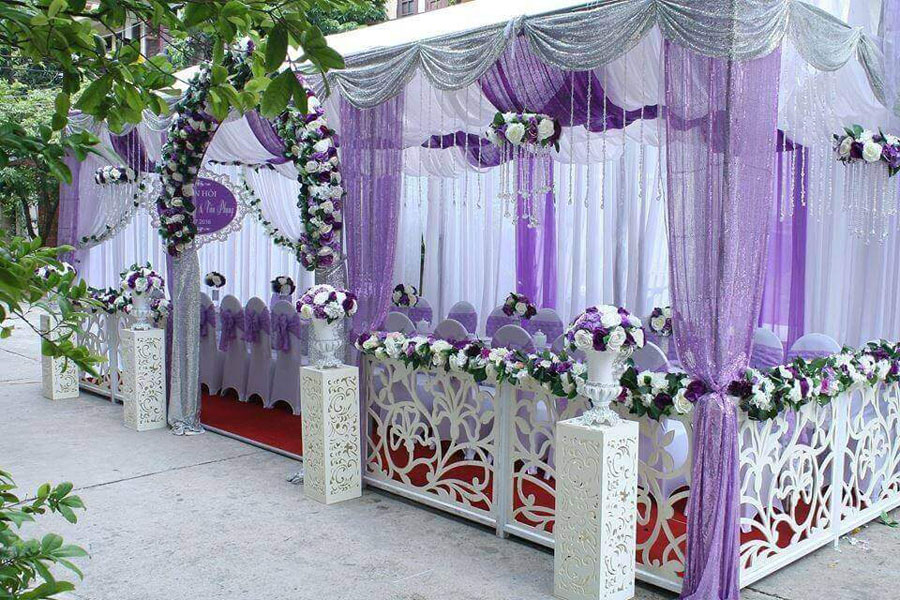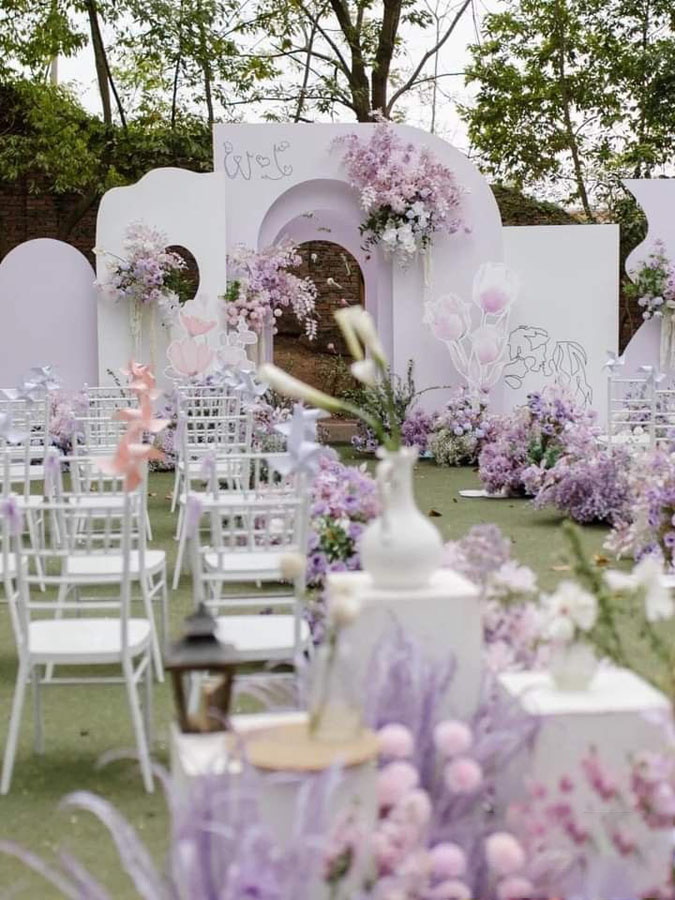 Tím lavender là biểu tượng của sự chung thủy và tình yêu vĩnh cửu, rất được các cô dâu Việt yêu thích. Khi kết hợp với be nhạt, sắc tím trở nên nhẹ nhàng và thanh thoát hơn, tạo nên không gian tiệc cưới ngọt ngào, tinh tế và tràn ngập cảm xúc.
