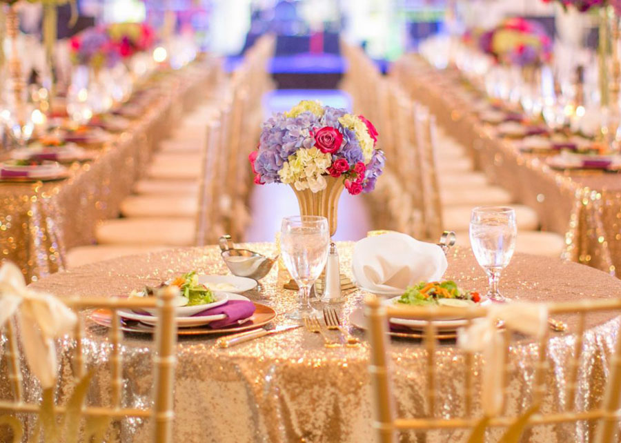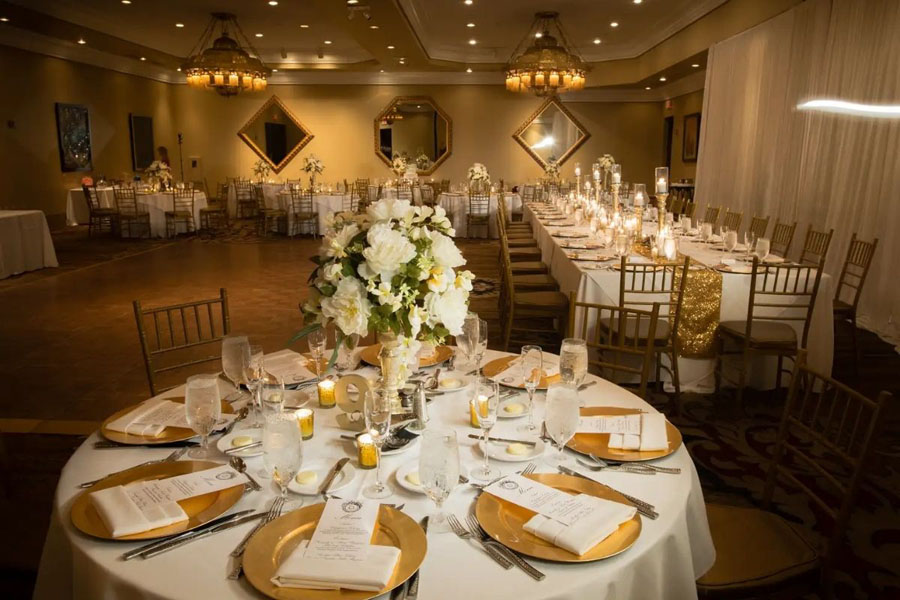 Với bảng màu trang trí tiệc cưới này, bạn có thể chọn hoa cưới màu trắng, trang trí bàn tiệc bằng ly thủy tinh ánh vàng, đèn chùm pha lê và ánh sáng ấm áp. Tất cả tạo nên một không gian vừa ấm cúng vừa lộng lẫy – lý tưởng cho tiệc cưới vào buổi tối.