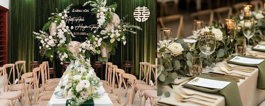Trang trí bàn tiệc với lá ô liu, hoa baby trắng hoặc hoa hồng kem sẽ giúp tổng thể trở nên mềm mại và thanh thoát. Bảng màu này đặc biệt phù hợp với những cặp đôi yêu thích phong cách tối giản, nhẹ nhàng nhưng vẫn sang trọng.