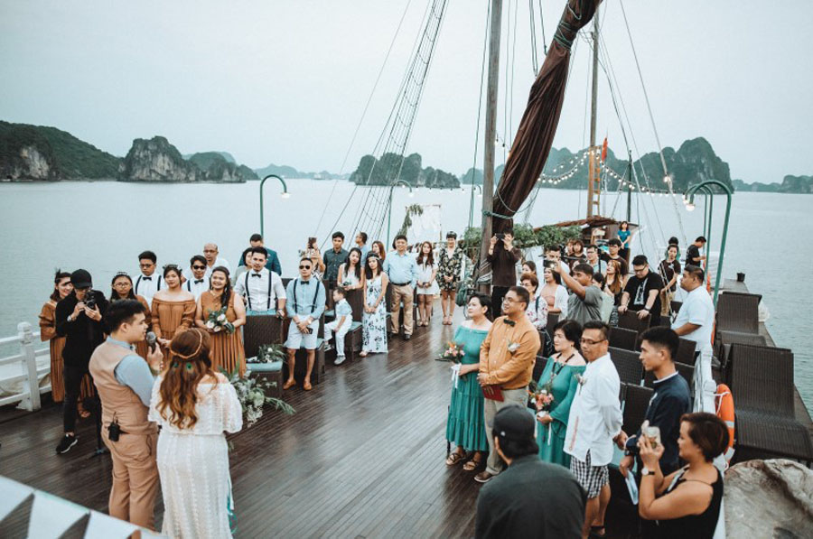 Nếu bạn muốn tìm một không gian mới lạ để kỷ niệm ngày cưới, tổ chức tiệc trên du thuyền là ý tưởng tuyệt vời. Vừa thưởng thức bữa ăn ngon, vừa ngắm toàn cảnh thành phố lung linh về đêm, đây chắc chắn sẽ là kỷ niệm khó quên.