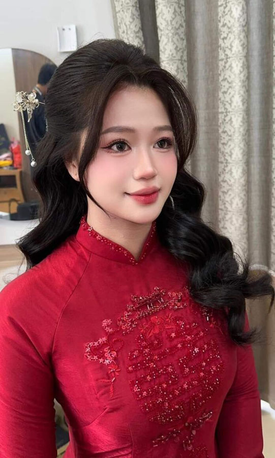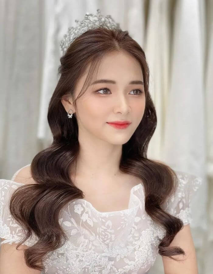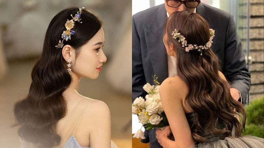 Kiểu tóc cô dâu này kết hợp giữa phần tóc buông xoăn và phần trên được cố định nhẹ, tạo nên vẻ đẹp dịu dàng.