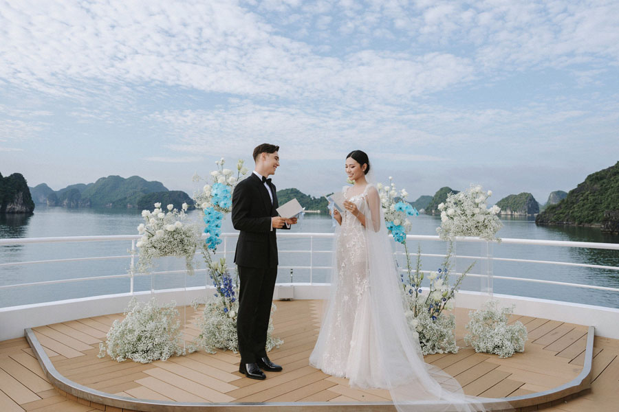 Tiệc cưới trên du thuyền thường gắn liền với hình ảnh sang trọng, tinh tế. Không cần trang trí quá cầu kỳ, bản thân du thuyền đã mang vẻ đẹp hiện đại, đẳng cấp. Điều này rất phù hợp với các cặp đôi yêu thích phong cách cưới tối giản, chú trọng cảm xúc và trải nghiệm hơn là hình thức hoành tráng. Tiệc cưới trên du thuyền cho phép cặp đôi tự do cá nhân hóa kịch bản và concept tổ chức. Từ phong cách trang trí, âm nhạc, ánh sáng cho đến thời điểm diễn ra buổi tiệc đều có thể điều chỉnh theo sở thích riêng.