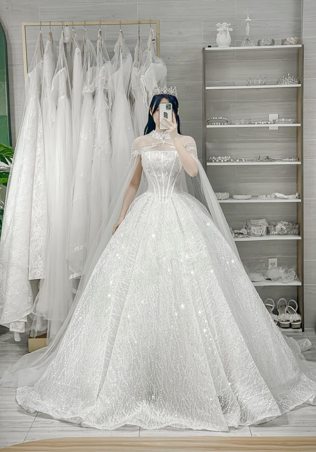 Váy cưới cape trong suốt đính đá – lấp lánh và tinh xảo