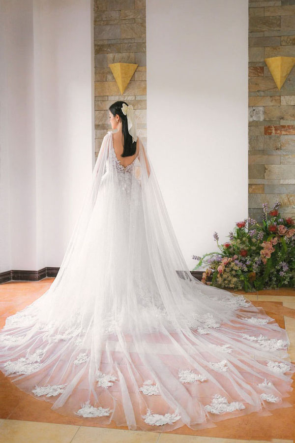 Váy cưới cape voan dài – mềm mại và thanh thoát